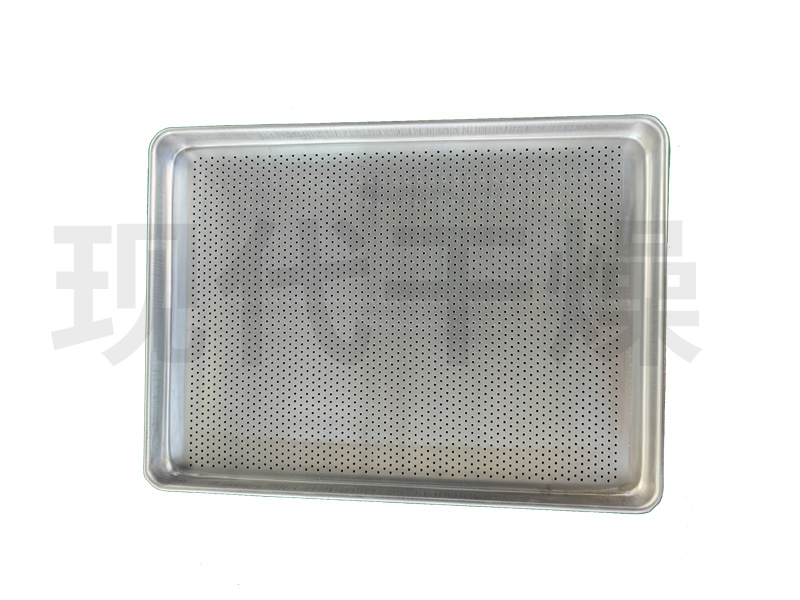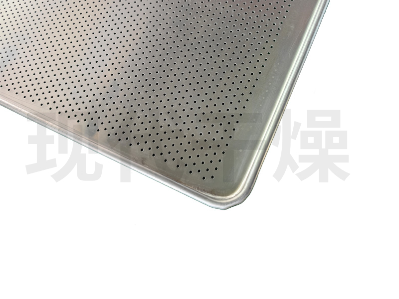 在上述各烘盘中,又以一次成型压制烘盘最为普遍,尺寸为640×460×45mm,主要由不锈钢或铝合金通过一次成型的方式压制而成,其角落光滑、四周翻边,保证了清洗彻底,及容易端托的优点,因而广泛使用在生产中。